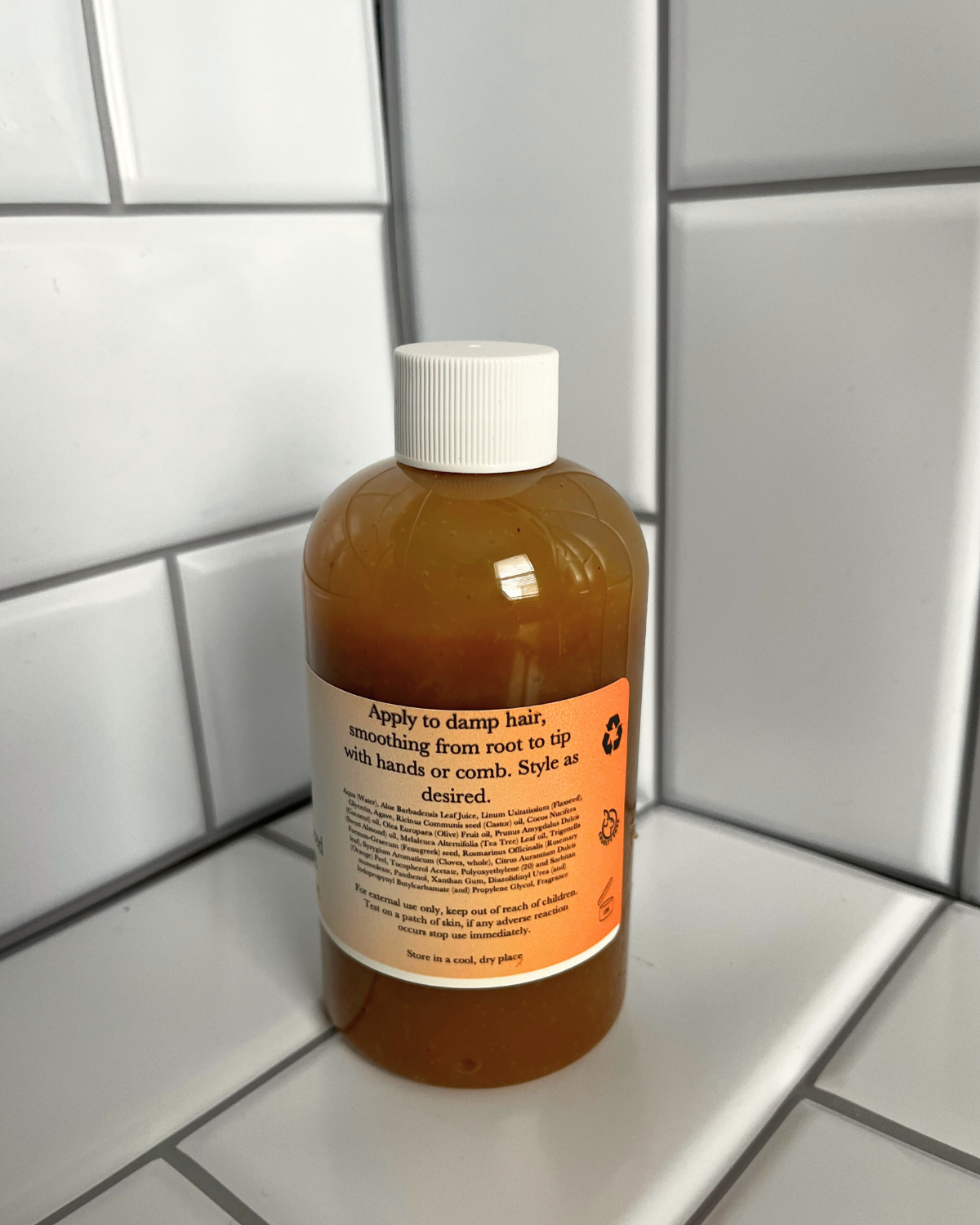 Ingredients: Aqua (Water), Aloe Barbadensis Leaf Juice, Linum Usitatissium (Flaxseed), Glycerin, Agave, Xanthan Gum, Ricinus Communis seed (Castor) oil, Cocos Nucifera (Coconut) oil, Olea Europaea (Olive) Fruit oil, Prunus Amygdalus Dulcis (Sweet Almond) oil, Melaleuca Alternifolia (Tea Tree) Leaf oil, Trigonella Foenum-Graecum (Fenugreek) seed, Rosmarinus Officinalis (Rosemary leaf), Syzygium Aromaticum (Cloves, whole), Citrus Aurantium Dulcis (Orange) Peel, Tocopherol Acetate, Panthenol, Polyoxyethylene (20) and Sorbitan Monooleate, Diazolidinyl Urea (and) Iodopropynl Butylcarbamate (and) Propylene Glycol, Fragrance