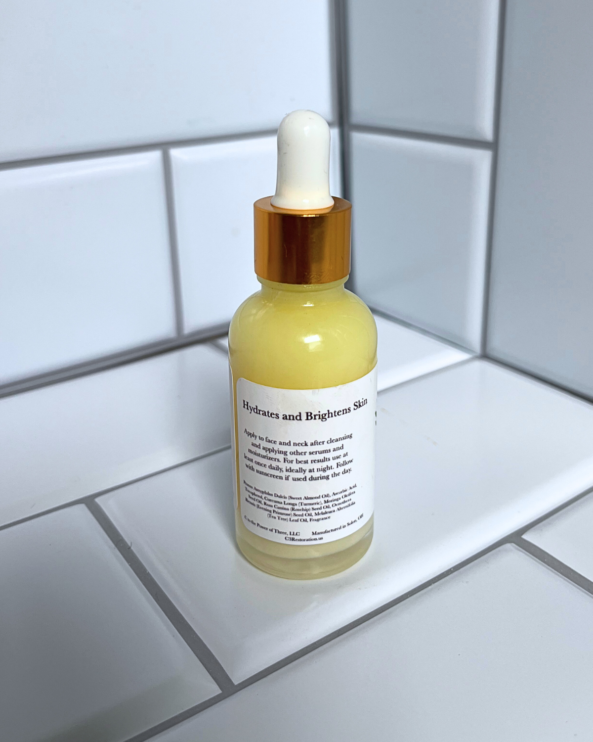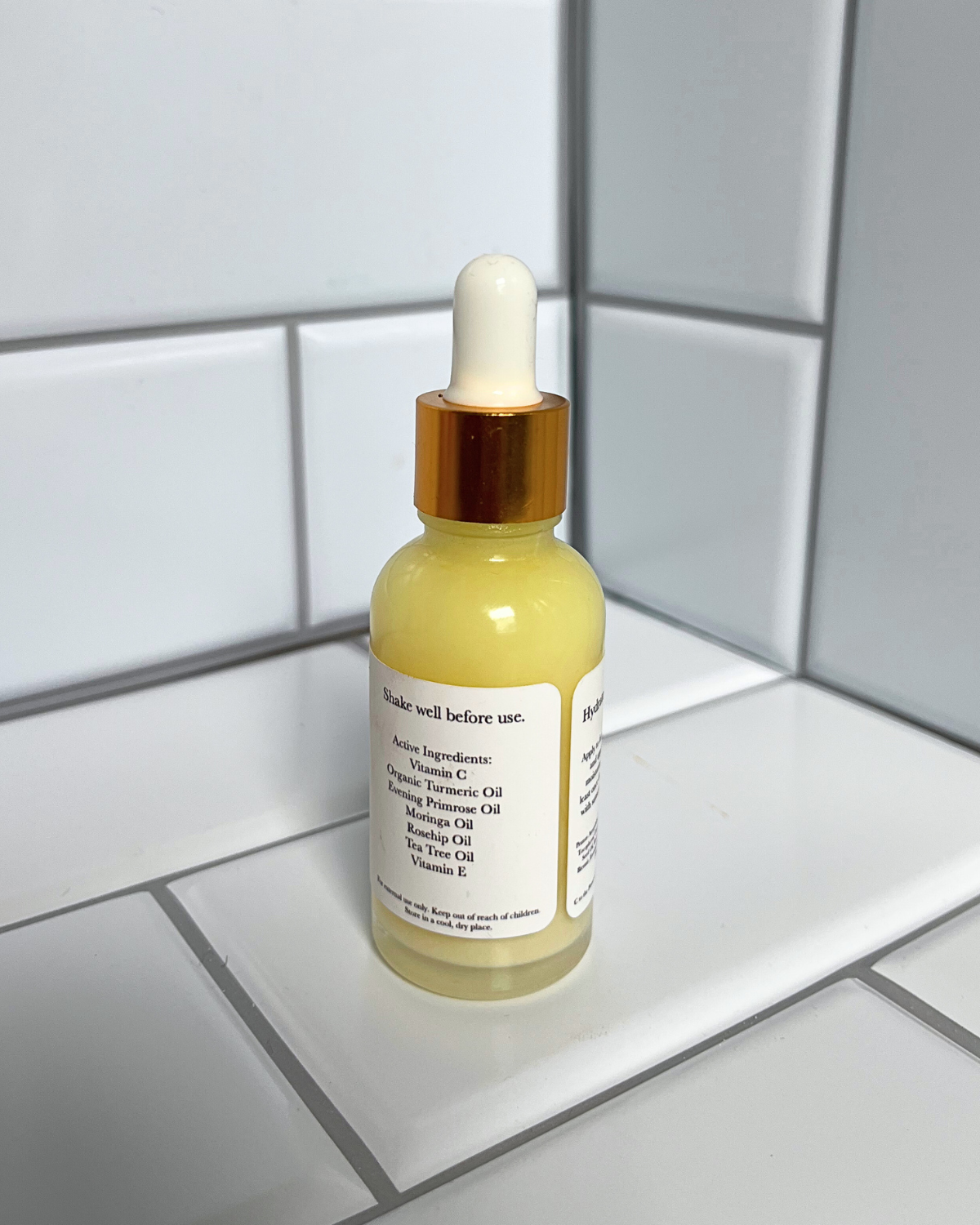 Active Ingredients: Vitamin C, Organic Turmeric Oil, Evening Primrose Oil, Moringa Oil, Rosehip Oil, Tea Tree Oil and Vitamin E.