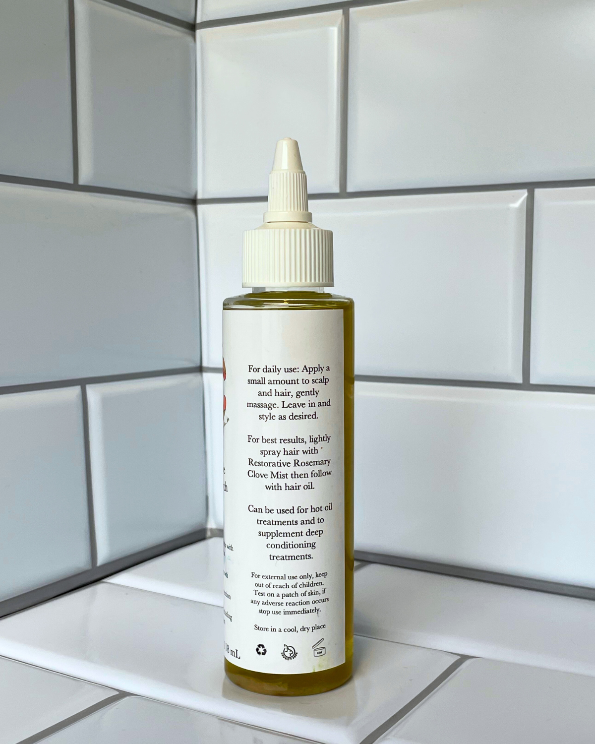 Apply a small amount to scalp and hair, gently massage. Leave in and style as desired. For best results, pair with our Restorative Rosemary Mist and use at least 2-3 times per week.